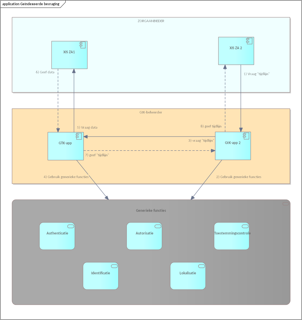 1) De eerste stap is nodig om een tijdlijn inzichtelijk te maken aan de zorgverlener. Deze tijdlijn bestaat uit verschillende metadata elementen, zoals en niet gelimiteerd tot; patiëntnaam, patiëntnummer, type gegeven en de vindplaats van de data zelf. De tijdlijn kan samengesteld worden vanuit de informatie uit verschillende zorgsystemen. Delen van deze tijdlijn worden beschikbaar gesteld via één of meerdere GtK’s. Om overvraging te voorkomen wordt gebruik gemaakt van een lokalisatie service. Hieronder wordt deze eerste stap in een diagram weergegeven.