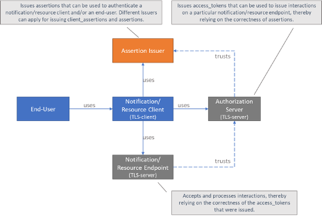 The role of Assertion Issuer can be performed by a third-party, but can also be performed by the Sending System or by the Receiving System. Assertion Issuers producing client assertions do not necessarily have to produce authorization assertions as well. Different Issuers can be used for these types of assertions. Before issuing an client assertion or an authorization assertion, the Assertion Issuer has to make sure that applicable requirements regarding user authentication and other mutual security agreements between the Sending System and Receiver System have been met.