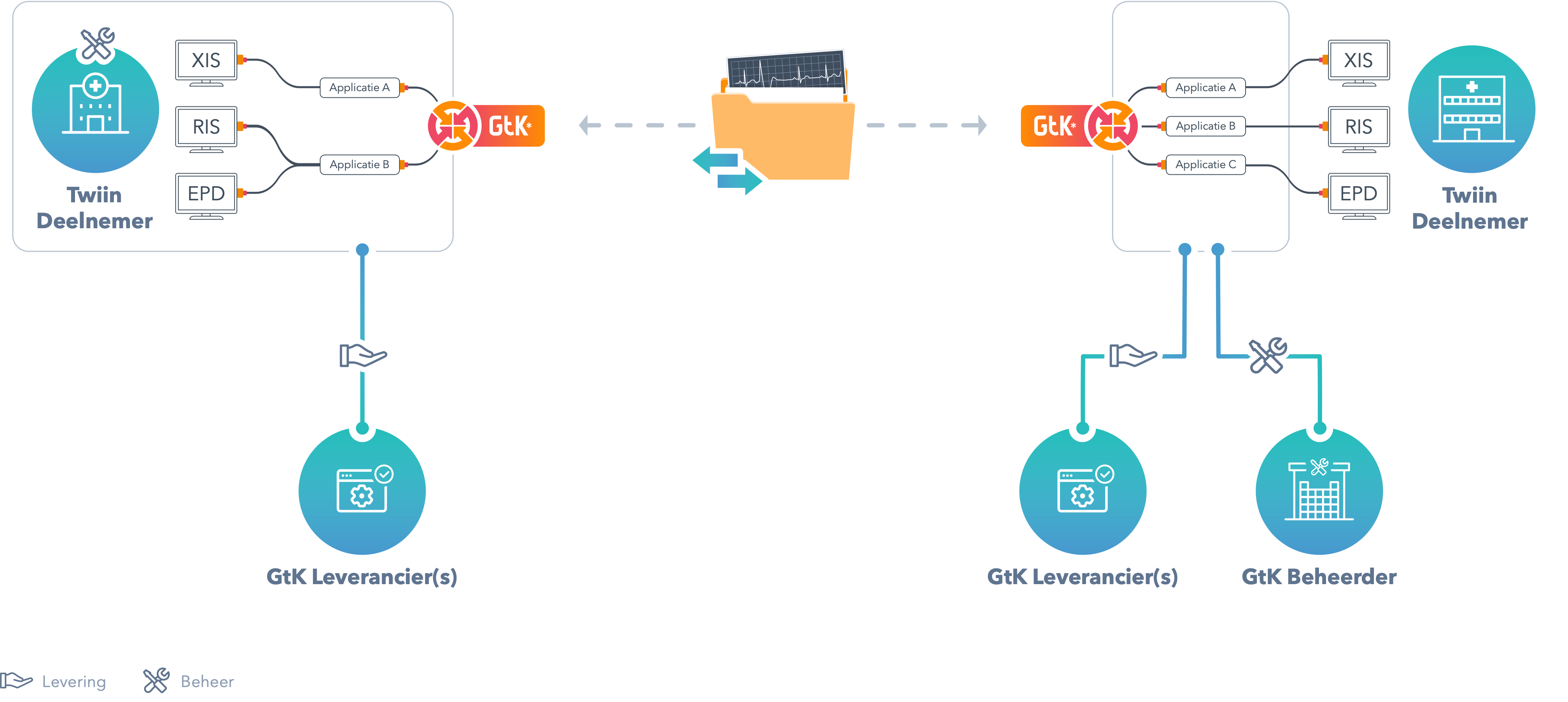 In bovenstaande figuur worden twee Twiin Deelnemers afgebeeld die gegevens volgens het Twiin Afsprakenstelsel uitwisselen voor een bepaalde zorgtoepassing. Zij maken hiervoor gebruik van verschillende GtK’s. De Twiin Deelnemer rechts heeft een GtK Beheerder ingeschakeld voor de onderdelen die het GtK vormen. De Twiin Deelnemer aan de linkerkant is een deelnemer die zelf GtK Beheerder is. Beide Twiin Deelnemers hebben ook te maken met leverancier(s) voor de onderdelen van de GtK’s.