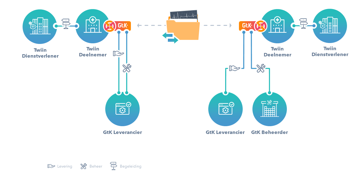 Bovenstaand figuur laat zien hoe de verschillende rollen zich tot elkaar verhouden. Centraal staan de Twiin Dienstverleners die gegevens uitwisselen door middel van een GtK. De figuur toont dat de Twiin Dienstverlener naast de Twiin Deelnemer staat om te begeleiden bij de implementatie van één of meer zorgtoepassingen. Verder laat de figuur zien dat er ruimte is voor verschillen in de wijze waarop partijen samenwerken. De GtK leverancier kan ook het beheer op zich nemen, terwijl het ook mogelijk is dat er een afzonderlijke partij is die het beheer op zich neemt. Deze krijgt dan de rol van GtK Beheerder.