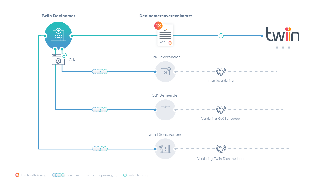 De Twiin Deelnemer (de zorgaanbieder) tekent de Twiin Deelnemersovereenkomst met de Twiin Organisatie. Een Twiin Deelnemer kan eventueel een Twiin Dienstverlener machtigen om dit namens hem te doen. Na toetreding kan de Twiin Deelnemer uitwisselen volgens het éénhandtekeningprincipe met andere Twiin Deelnemers die voldoen aan dezelfde Samenwerkingsvoorwaarden. De Twiin Dienstverlener houdt bij welke andere Twiin Deelnemers voldoen aan dezelfde Samenwerkingsvoorwaarden. Door het tekenen van de Deelnemersovereenkomst is de Twiin Deelnemer gehouden om om toe te werken naar validatie voor één of meerdere zorgtoepassingen (inspanningsverplichting). Vanaf validatie moet de Twiin Deelnemer voldoen aan alle Twiin voorwaarden en kan de Twiin Deelnemer landelijk gegevens uitwisselen.